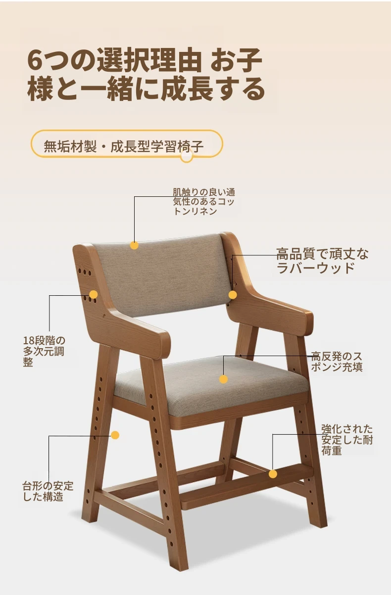 【7-18歳向け】ナチュラルウッドカラー学習椅子 -輸入ラバーウッド